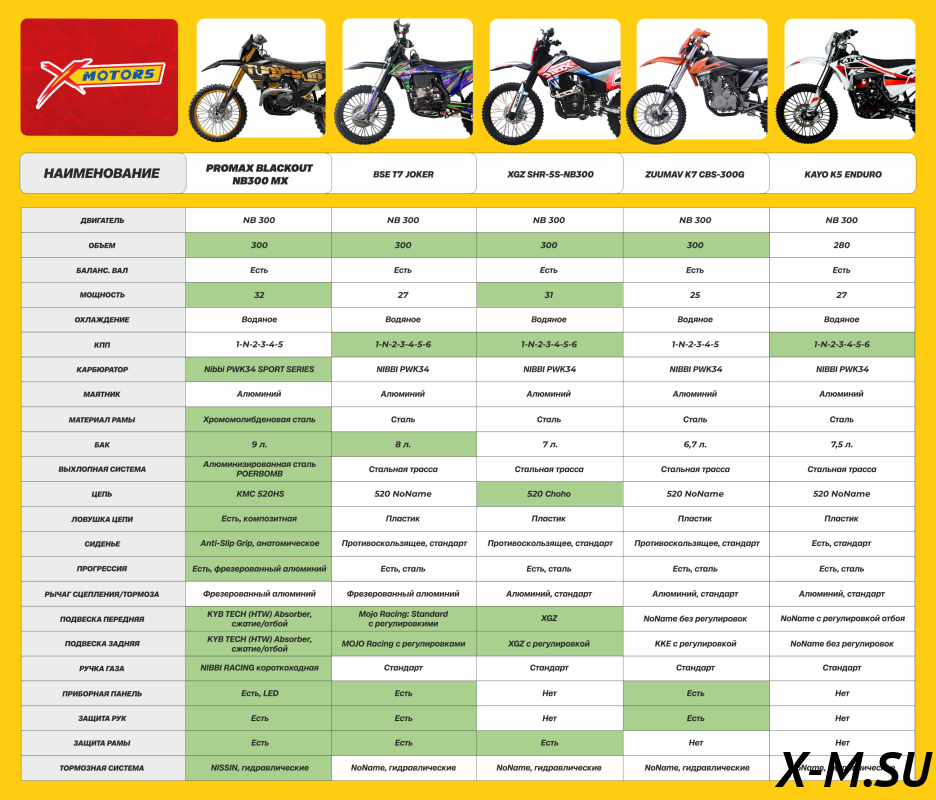 Мотоцикл PROMAX BLACKOUT NB300 - крутой агрегат! Качество сборки на высоте, запчасти все именитых брендов: KYB, NISSIN, Kenda. Двигатель работает как часы, тяга отличная. Подвеска мягкая, глотает все неровности. Пластик прочный, выдерживает даже жесткие падения. Единственное, что немного смущает - отсутствие электростартера, но я привык. В целом, очень доволен покупкой!